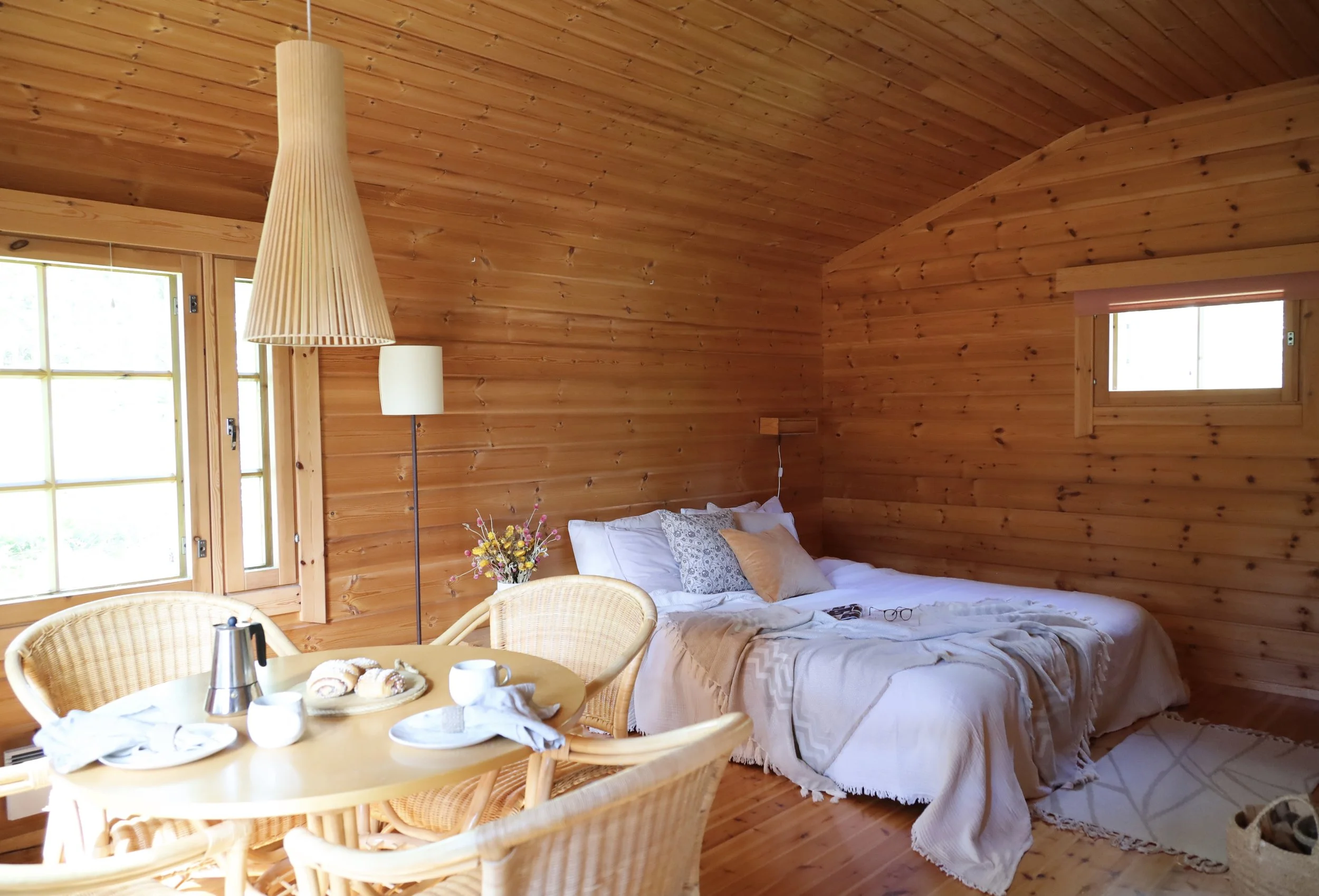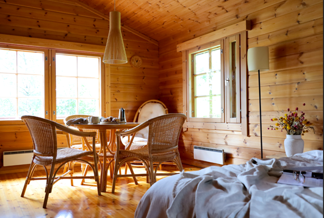 Moni ajattelee, että vanhat mäntyseinät pitäisi peittää tai maalata, mutta oikeilla valinnoilla ne voivat hehkua lämpöä ja rauhaa. Pehmeät tekstiilit, luonnonvalossa hohtavat puupinnat ja huolella valitut värit ja esineet tekevät tilasta levollisen ja kutsuvan. Ei tarvitse purkaa eikä rakentaa. Riittää, että kuuntelee, mitä tila haluaa kertoa. Oikein tehty stailaus pehmentää tilan ilmeen ja tuo mökin parhaat puolet esiin. Se kutsuu astumaan sisään ja jäämään. Vai mitä olet mieltä?