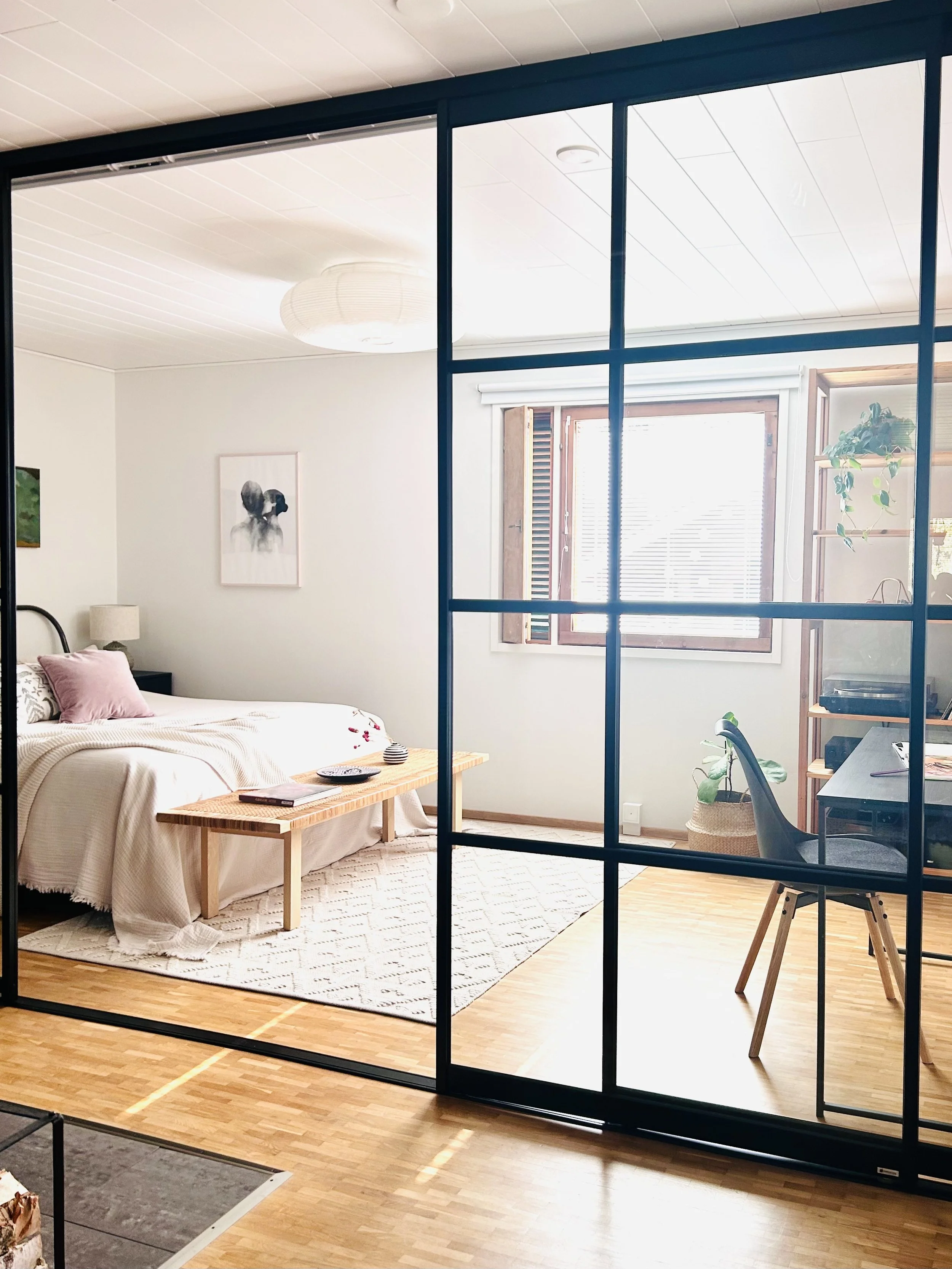 Koska takkahuone ei ollut varsinaisesti huone vaan avoin tila ja lisäksi sen kautta oli kulku talon ainoaan kylpyhuoneeseen ja saunaan, päädyttiin tilasta jakamaan makuuhuone lasiliukuovilla. Oviaukko mitoitettiin keskelle lasiseinää, jolloin takka jäi juuri oviaukon kohdalle ja tilan saisi tarvittaessa taas myöhemmin takkatilaksi/huoneeksi. Lasiseinän lisäksi asennettiin makuuhuoneen puolelle kattoon lähes huomaamaton verhokisko. Vanhan makuuhuoneen pimennysverhot riittivät juuri peittämään koko seinän ja tuovat lisäksi huoneeseen yksityisyyttä. Riittävän leveä kulku kylpyhuoneeseen säilyi takan ja lasiseinän välissä ja käytävän päätyyn saatiin yksi vaatesäilytys lisää irrallisella säilytysjärjestelmällä sekä verhokiskolla ja verholla. Koko vaatesäilytyksen saa tarvittaessa helposti purettua pois ilman pysyviä jälkiä, jos makuuhuoneen haluaisi joskus muuttaa takaisin takkahuoneeksi.